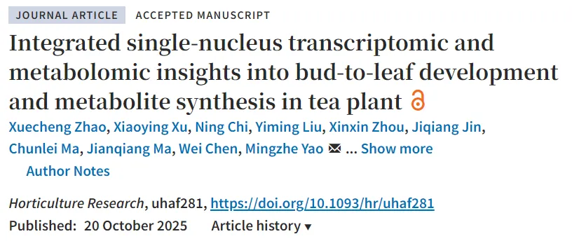 近日,中国农业科学院茶叶研究所等合作单位在期刊Horticulture Research上发表了一篇题为“Integrated single-nucleus transcriptomic and metabolomic insights into bud-to-leaf development and metabolite synthesis in tea plant”的研究成果。