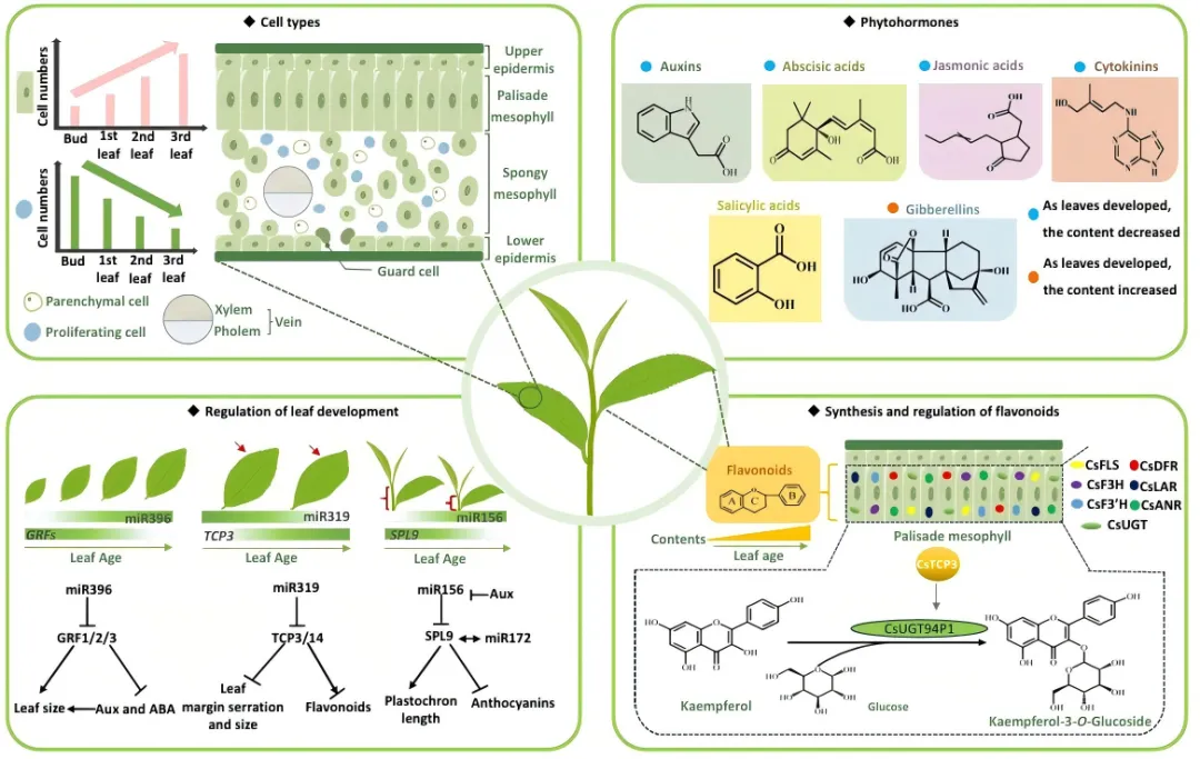 茶树是一种多年生常绿木本植物,其芽叶经过加工可制成茶饮。茶的品质与风味取决于新芽中次生代谢物的合成与积累,包括黄酮类、氨基酸、生物碱和萜类化合物。尽管学界已对次生代谢物的生物合成与调控机制展开深入研究,但协调芽叶发育与代谢的整合机制仍不甚明了。
