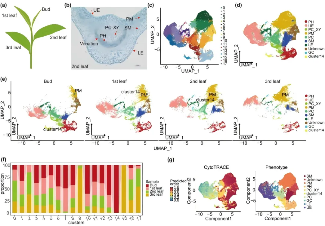 研究人员对茶树新梢(包括顶芽、第1叶、第2叶和第3叶)进行了snRNA-Seq分析(图1a)。组织切片显示,叶片中存在上表皮(UE)、下表皮(LE)、栅栏组织(PM)、增殖木质部细胞(PC-XY)、韧皮部细胞(PH)和海绵组织(SM)等多种细胞类型(图1b,图S1a-d)。经过数据质控,共获得48,047个高质量细胞核,每个样本保留8,855-12,179个细胞核。降维聚类分析鉴定出17个不同的细胞簇,并根据标记基因将其归类为8种细胞类型:PM、UE、LE、PC-XY、PH、SM、增殖细胞(PC)和保卫细胞(GC)(图1c-d,图S2a-b)。值得注意的是,PM细胞的比例从芽到叶发育过程中逐渐增加,而PC细胞的比例则下降(图1e)。特别关注的第14细胞簇主要分布在芽中(图1f),可进一步分为6个亚簇,其基因富集于蛋白质同源二聚化、胞质过程、多细胞生物发育等关键代谢过程,表明该簇在促进芽细胞发育中起关键作用。