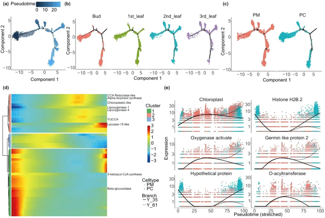 通过Monocle 2软件包分析,发现了四个关键的分支点,对应不同的细胞分化状态(图2a-b)。在早期发育阶段,芽显示出初始的分化模式,PM和PC细胞表现出典型的变化(图2c)。通过分支特异性分析,鉴定出与PM和PC分化相关的Top 50基因,这些基因富集于苯丙烷生物合成、单萜类合成、光合作用、α-亚麻酸代谢和脂肪酸延伸等通路(图2d)。对分支节点4的进一步分析揭示了显著改变的基因,这些基因富集于叶绿体组织和光合作用等过程。这些结果表明,在叶片发育过程中,PM细胞逐渐适应光合功能,而PC细胞随着组织成熟而减少,反映了叶片发育过程中组织生存和功能所需的适应性变化。