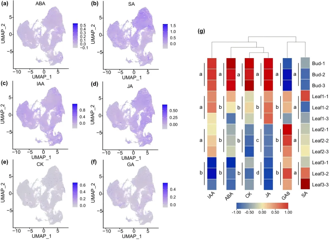 植物激素是植物生长发育的关键调节因子。为了阐明茶树芽叶发育过程中植物激素的合成和积累模式,研究人员采用了多组学方法。可视化分析揭示了6种激素相关合成基因的表达模式(图3a-f)。积累分析显示,六种激素在芽叶不同发育阶段的积累量存在差异:IAA、ABA、JA和CK随着组织发育而减少,而GAs则增加(图3g)。这些动态变化表明,不同的激素在协调芽叶发育过程中扮演着不同的角色,例如JA和ABA可能参与早期防御反应,而GAs则促进细胞伸长和组织成熟。
