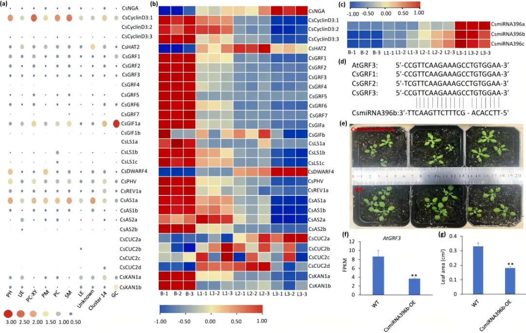 通过分析snRNA-seq和RNA-seq数据,研究人员可视化了参与细胞分裂和叶片发育的关键基因(如TCPs、GRFs、GIFs、CUCs)的动态表达模式(图4a-b)。转录组测序鉴定出几个在芽叶发育过程中具有动态表达模式的miRNAs。有趣的是,CsmiRNA156s、CsmiRNA164s和CsmiRNA396s的表达水平随着组织发育而增加,而CsmiRNA319s则下降(图4c)。进一步分析确定了关键的miRNA-靶基因对(图4d)。例如,转基因研究表明,CsmiRNA396b通过靶向抑制AtGRF3表达,从而抑制拟南芥的叶片大小和重量(图4e-g)。这一结果归因于miR396通过影响GRF表达作为有丝分裂细胞分裂的负调控因子。这些发现表明,miRNAs通过靶向特定的调控基因,在茶树芽叶发育轨迹中发挥着关键作用。