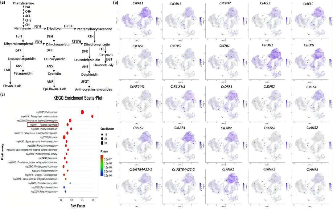 茶树新梢富含次生代谢物,尤其是类黄酮(图5a)。代谢组学分析揭示了类黄酮(包括黄酮醇、儿茶素和花青素)在芽叶发育过程中的动态积累模式(图5b)。大多数类黄酮的含量随着叶片成熟而增加。PM细胞类型的KEGG富集分析显示,其显著富集于类黄酮生物合成途径(图5c)。基因表达可视化证实,主要的类黄酮生物合成基因随着类黄酮的积累持续上调。相比之下,氨基酸(特别是L-茶氨酸)则呈现相反的趋势,在芽中积累较高,在叶片发育过程中下降。这种差异反映了代谢物的功能特化:类黄酮提供防御,而氨基酸有助于早期生长。