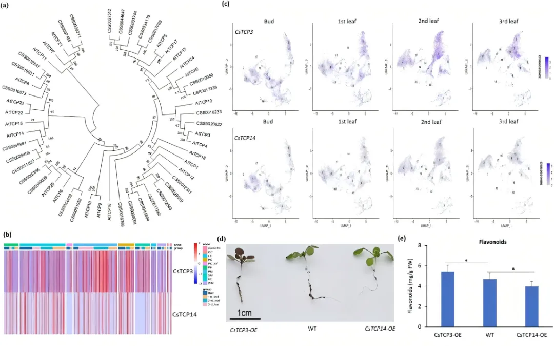 系统发育树分析将茶树TCP转录因子分为两类:I类TCPs(如CsTCP14)促进组织发育,II类TCPs(如CsTCP3)抑制细胞分裂(图6a)。snRNA-Seq和RNA-Seq联合分析显示,CsTCP3和CsTCP14在组织发育过程中呈现相反的表达式模式(图6b-c)。CsTCP3的表达随着组织成熟而增加,主要定位于PM细胞,与类黄酮积累呈正相关;而CsTCP14的表达则在发育过程中下降。转基因植物实验进一步验证了这些结果:CsTCP3过表达(CsTCP3-OE)增强了类黄酮积累,而CsTCP14过表达则抑制了类黄酮积累(图6d-e)。此外,在转基因植物中观察到显著的叶片表型差异:与野生型相比,CsTCP3过表达抑制了叶片大小并减少了叶缘锯齿,而CsTCP14过表达则促进了叶片增大并抑制了锯齿。功能分析表明,抑制CsTCP3表达会导致CsUGT94P1下调并相应减少黄酮醇苷含量。总之,CsTCP3和CsTCP14在调控类黄酮生物合成和叶片发育中扮演拮抗角色。