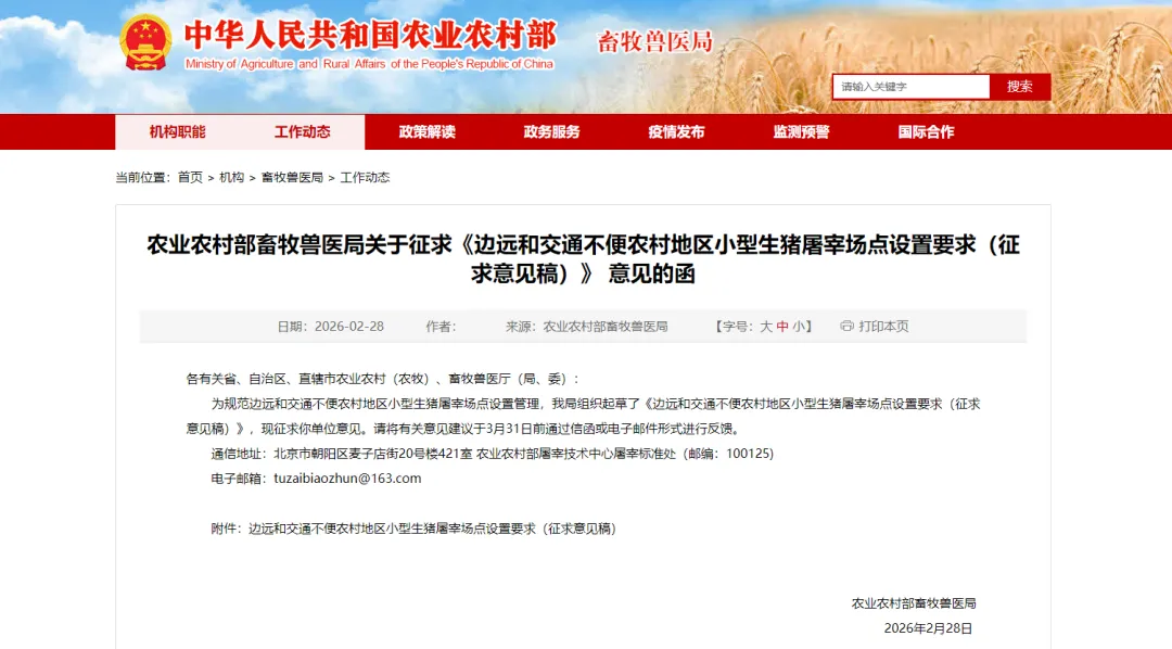 为规范边远和交通不便农村地区小型生猪屠宰场点设置管理,我局组织起草了《边远和交通不便农村地区小型生猪屠宰场点设置要求(征求意见稿)》,现征求你单位意见。请将有关意见建议于3月31日前通过信函或电子邮件形式进行反馈。