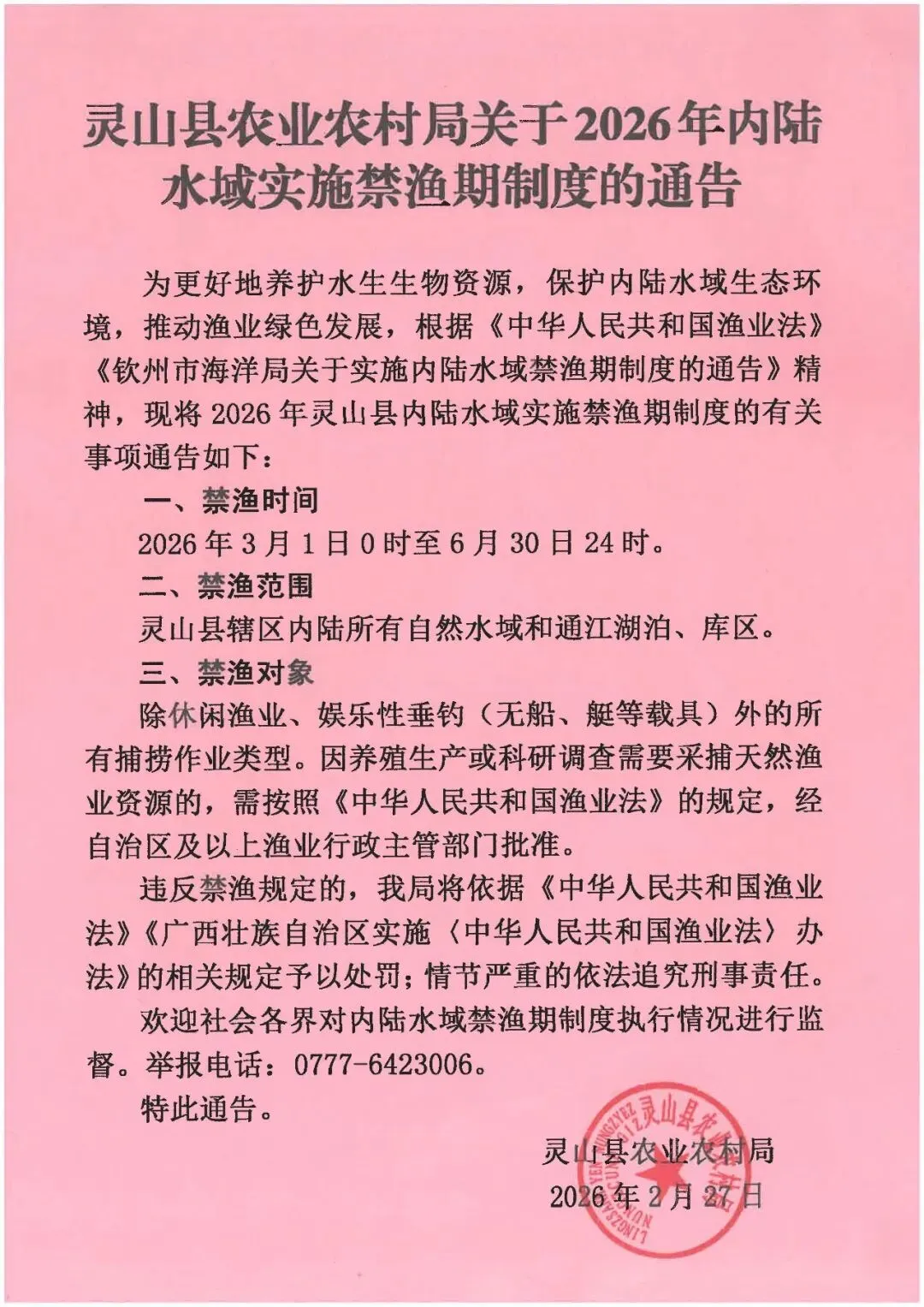 灵山县农业农村局关于2026年内陆水域实施禁渔期制度的通告
