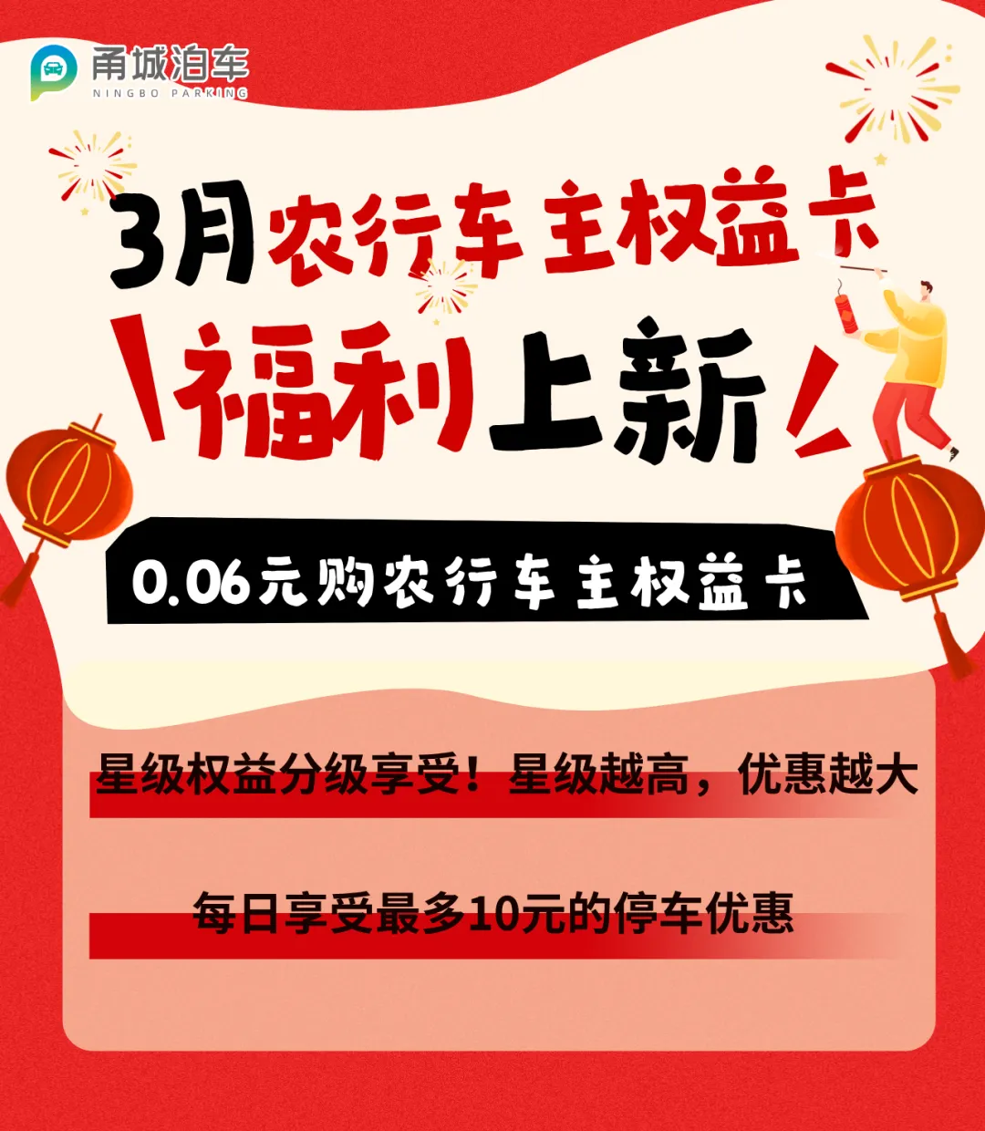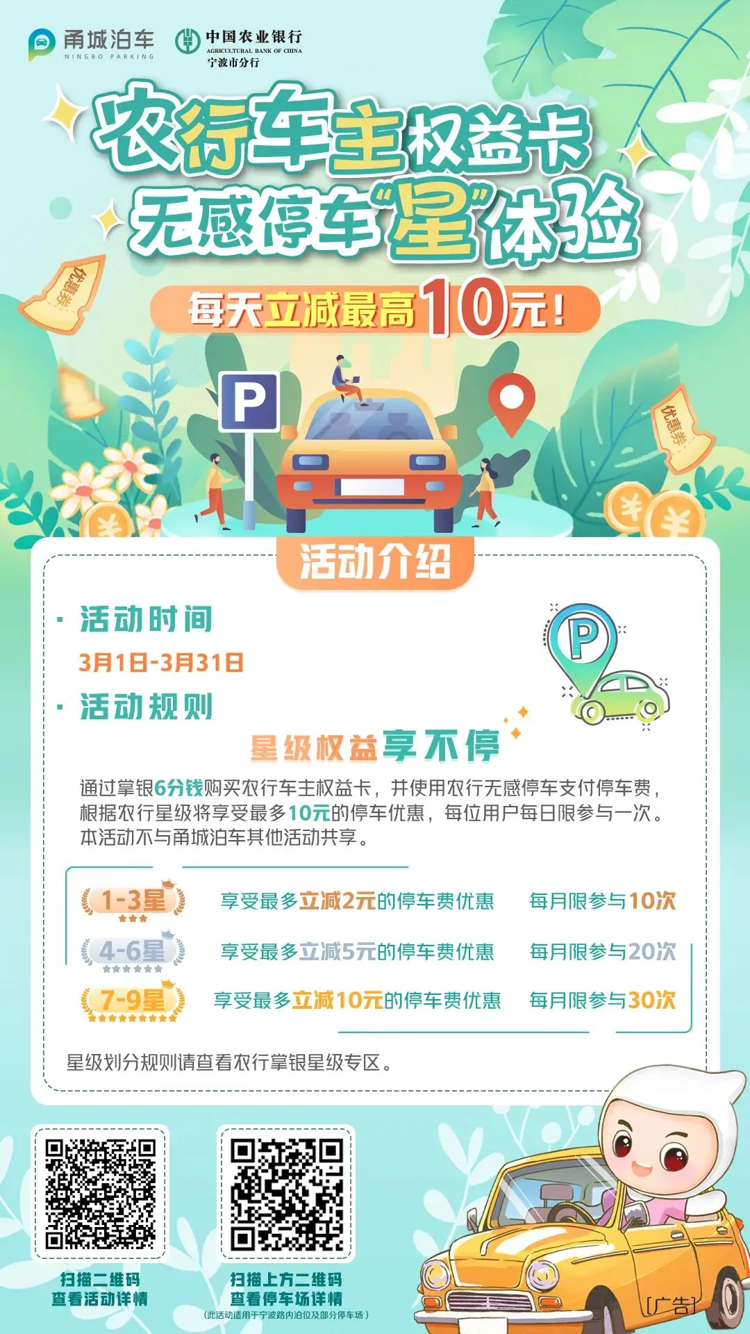 购买权益卡并开通农行免密支付,星级权益分级享受,星级越高,优惠越大!每日最高立减10元!(若单笔停车费不超过10元,用户仅需支付1分钱;若单笔停车费超过10元,所需支付金额立减10元,其余星级权益规则同上。)