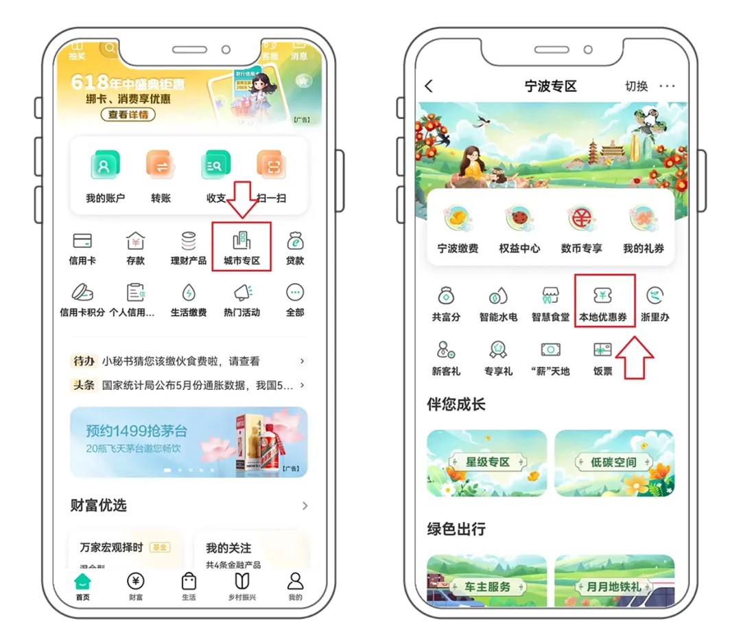 用户进入【中国农业银行】APP 后,点击【城市专区】选择【本地优惠券】。
