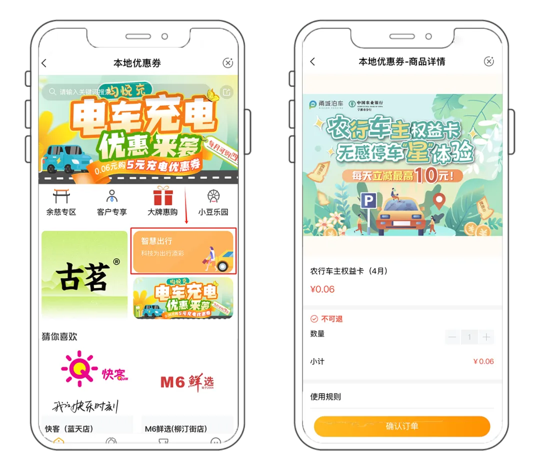 进入【本地优惠券】后,点击【智慧出行】,0.06元购买【农行车主权益卡】,分级享受甬城泊车农行无感停车支付优惠~