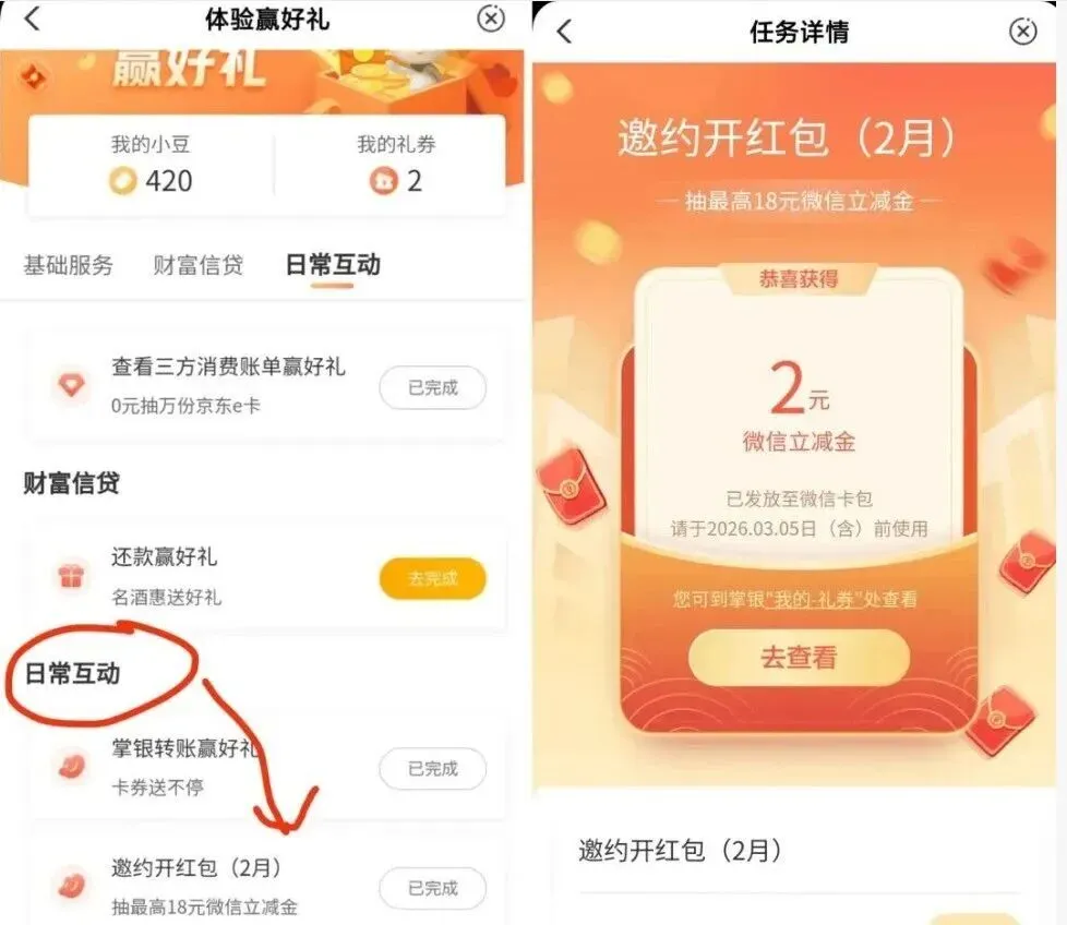 路径:中国农业银行APP-热门活动-体验赢好礼,下拉找到:日常互动,邀约开红包,抽最高18元微信立减金