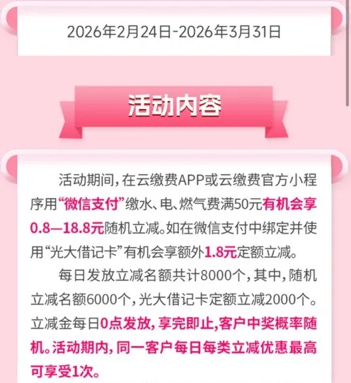 中国农业银行储蓄卡用户可参与,直接在热门活动里面进就可以参与,我中2元立减金,也有豆子的,另外部分地区有欢乐闹元宵,最高抽88元微信立减金,月月享好礼,抽最高88元微信立减金,每个地区都不一样!