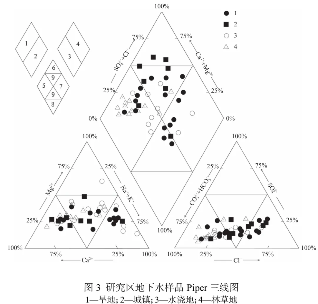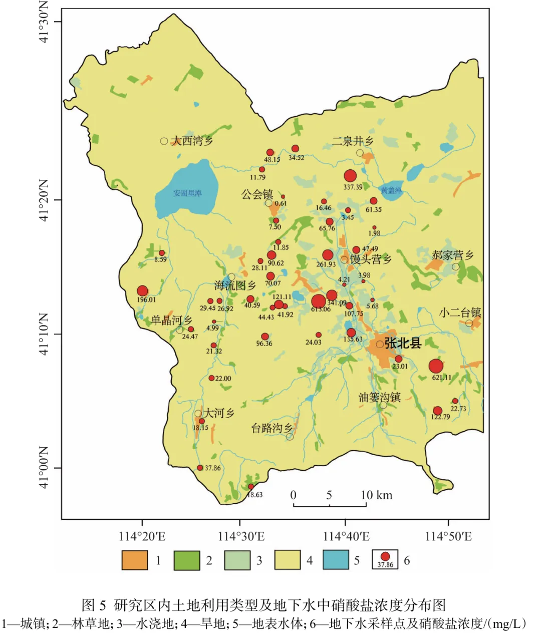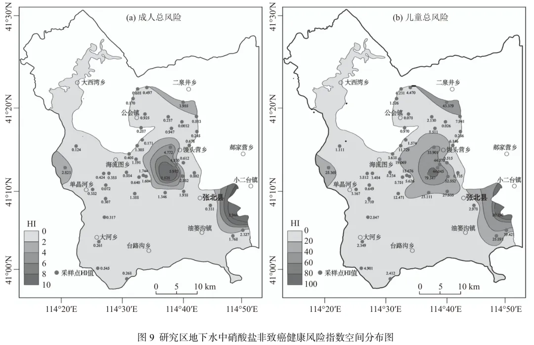 河北省坝上地区地下水硝酸盐污染问题不容忽视,因此厘清地下水中硝酸盐成因并开展健康风险评价具有重要现实意义。 本文选择河北坝上玄武岩分布区,利用45组地下水水化学及氢氧稳定同位素数据,识别了区内地下水中硝酸盐分布特征及成因,并针对氮污染问题开展了地下水硝酸盐的健康风险评价。研究结果 研究区地下水中硝酸盐平均浓度为86.08 mg/L,26.6%的采样点质量浓度超过《地下水质量标准》(GB/T 14848—2017)中III类地下水硝酸盐限量值(20 mg/L);不同土地利用类型条件下地下水中硝酸盐含量差异较大,其中城镇区地下水中硝酸盐质量浓度最高,水浇地次之,林草地和旱地最小。区内地下水中硝酸盐的主要来源为牲畜粪肥及生活污水混合入渗,其次为农业化肥淋滤。基于健康风险评价模型,成人和儿童通过饮水摄入硝酸盐的健康风险较高,占总健康风险贡献率的99.23%,远大于皮肤接触途径。其中儿童经饮水摄入和皮肤接触两种途径的健康风险均显著高于成人,75.55%的采样点地下水中硝酸盐对儿童的健康风险超出了可接受水平。结论从供水安全角度,建议对高风险地区增加净水设备降低人体健康风险。