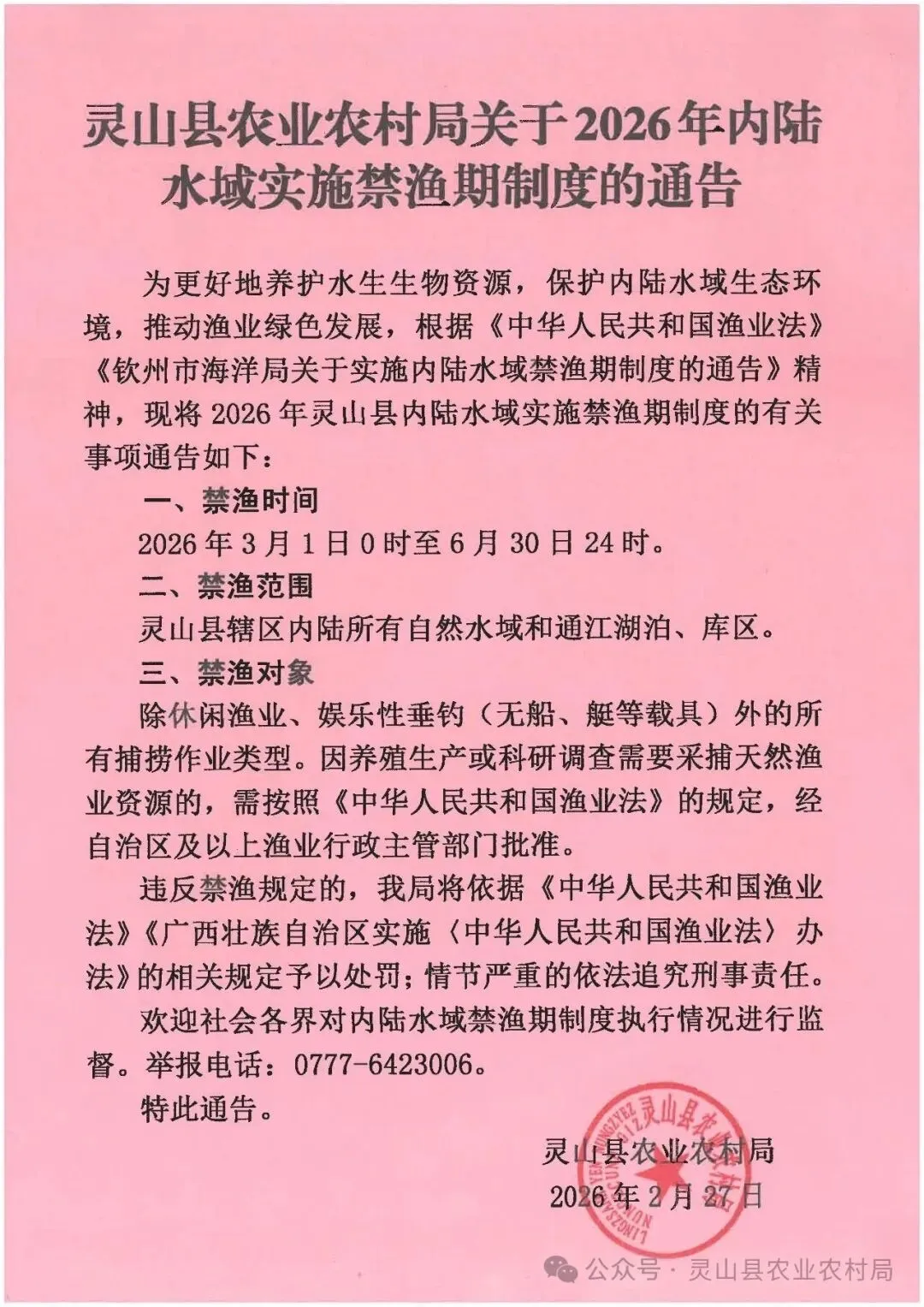 ▷灵山县农业农村局2026年内陆水域实施禁渔期通告