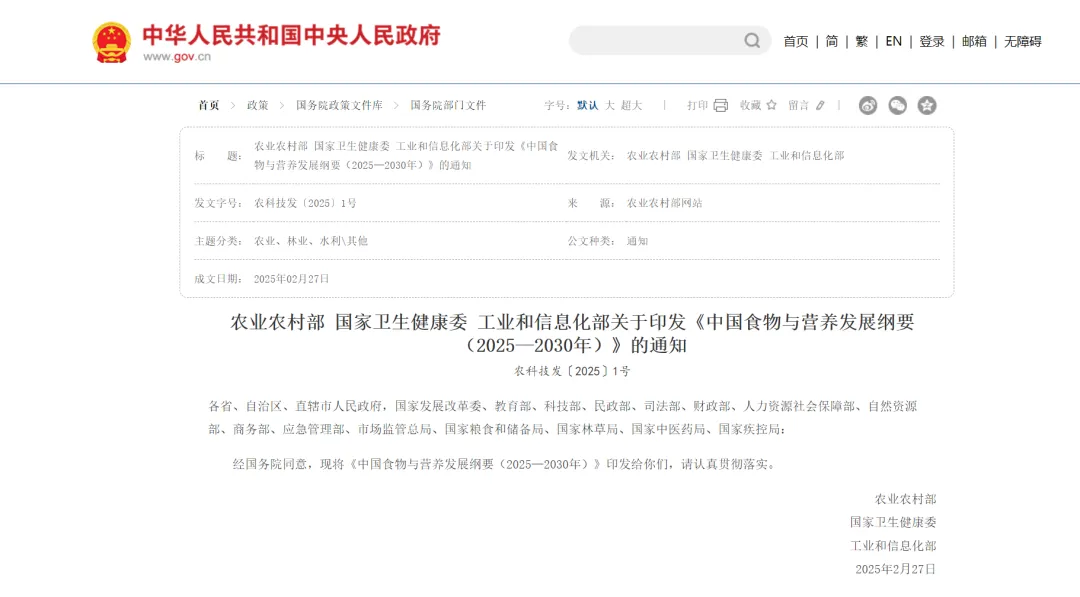农业农村部 国家卫生健康委 工业和信息化部关于印发《中国食物与营养发展纲要(2025—2030年)》的通知