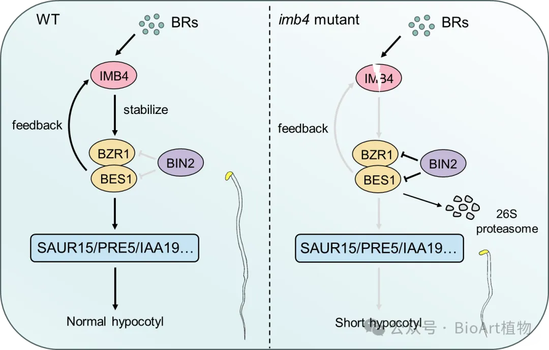 图IMB4通过BR途径调控下胚轴伸长的工作模型