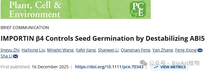 该团队近期还在Plant, Cell & Environment上以Brief Communication的形式发表题为发表了题为IMPORTIN β4 Controls Seed Germination by Destabilizing ABI5的研究。该文报道了IMB4通过促进ABI5经26S蛋白酶体降解途径,并干扰BN2对ABI5的稳定作用,从而在种子萌发过程中负调控脱落酸(ABA)信号,降低拟南芥种子对ABA的敏感性。