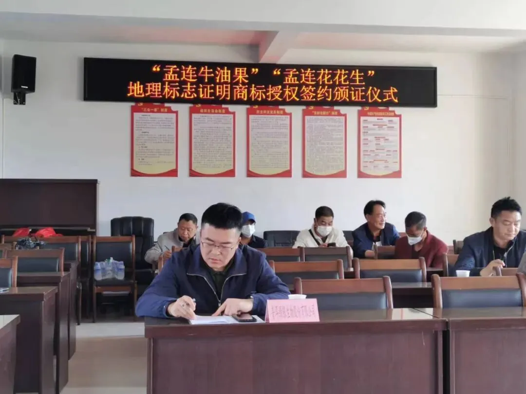 孟连县农业农村和科学技术局,孟连县市场监督管理局向国家知识产权局提交了“孟连牛油果”、“孟连花花生“两个地理标志证明商标的使用备案申请,目前国家知识产权局已批复。2023年1月18日,由孟连县人民政府牵头,县农业农村和科学技术局、县市场监督管理局参加,举行地理标志证明商标授权签约颁证仪式。县政府分管领导作重要讲话,县市场监督管理局对地理标志证明商标规范使用进行了培训,通过授权使用,让孟连企业增强对知识产权保护的意识,为孟连经济健康发展作出有力贡献。