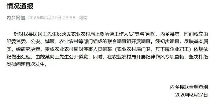 针对我县居民王先生反映去农业农村局上厕所遭工作人员“辱骂”问题,内乡县第一时间成立由纪委监委、公安、城管、农业农村等部门组成的联合调查组开展调查。经初步调查,反映基本属实。