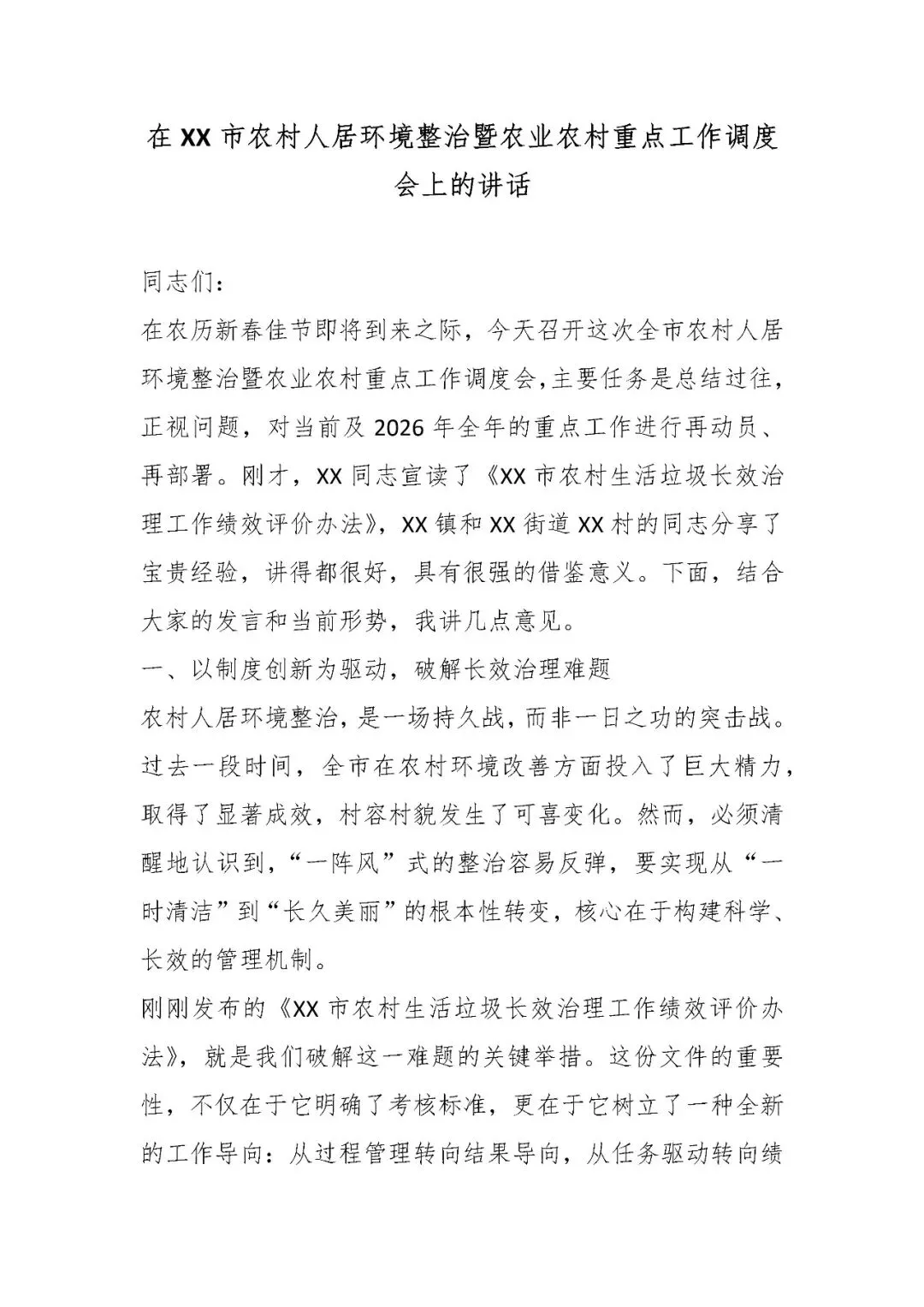 >在XX市农村人居环境整治暨农业农村重点工作调度会上的讲话