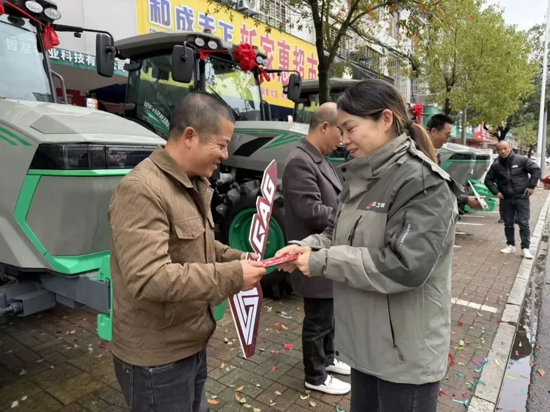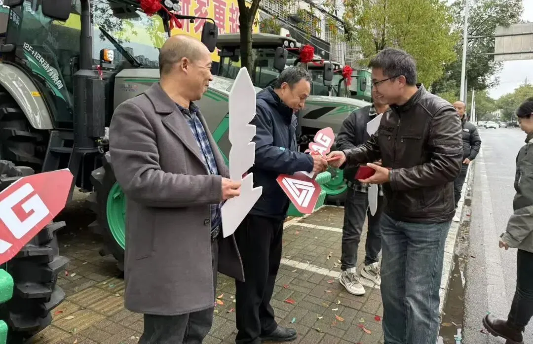 交车仪式现场,湖南东欣智慧农业科技有限公司负责人唐少华、刘国秀,门店店长张柏英,以及 5 位采购拖拉机的客户代表共同出席。仪式上,双方现场签订采购合同,公司负责人详细介绍设备性能优势、操作要点及全流程售后保障服务,并将象征丰收致富的金钥匙郑重交到客户手中。现场还为客户送上暖心红包,气氛热烈喜庆,大家共同合影留念,见证这一务实惠民的重要时刻。