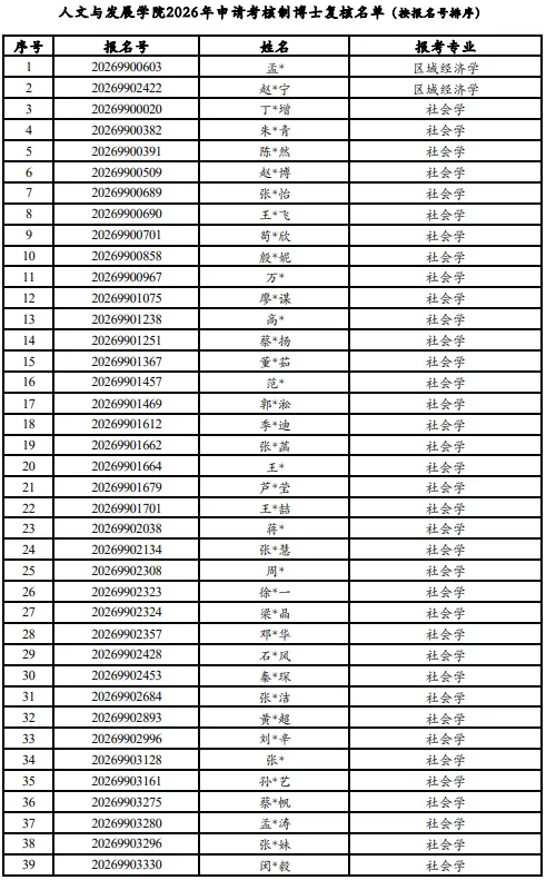 按照教育部、北京市招生考试委员会及学校相关文件要求,根据《中国农业大学2026年博士研究生招生章程》《2026年中国农业大学人文与发展学院博士研究生招生实施方案》,以确保安全性、公平性和科学性为前提,坚持科学评价、择优录取的原则,制定本细则。学院成立2026年博士研究生招生工作领导小组,负责全院博士生复核工作的统一领导和统筹管理,制定学院复核工作实施细则,指导复核小组具体开展考核工作,同时负责处理招生过程中考生提出的质疑和申诉。学院以学科为单位分别组织社会学、公共管理学、区域经济学(二级学科)博士复核工作。根据《2026年中国农业大学人文与发展学院博士研究生招生实施方案》,学院组织专家对申请考核人员提交的电子版材料进行了初审,确定复核名单(见附件1)。复核前申请人应认真阅读并提前签署《报考中国农业大学2026年博士研究生考生诚信考试承诺书》(附件2)。申请人须准备8分钟的面试自我陈述PPT。内容可包括个人简介、研究积累、博士研究计划或其他与博士学习相关的重要内容。请在指定时间内将承诺书及PPT发送至指定邮箱(时间及邮箱请见各学科复核微信群通知)。初审合格的申请人进入复核阶段时需提交纸质材料,具体要求请详见各学科复核微信群通知。同时,请考生留存好材料原件,新生报到时需提交部分材料原件(另行通知),以存入个人人事档案。1. 复核主要考查申请人综合运用所学知识的能力,对本学科前沿知识及最新研究动态掌握情况,英语听说能力以及思想品德、诚实守信、心理健康等方面的素质,综合判断申请人是否具备攻读博士学位的潜质。2. 复核总成绩满分100分,其中笔试成绩、面试成绩各占50%。面试成绩中,外语成绩占10%、专业综合水平成绩占90%。思想品德考核成绩分为合格、不合格,考核成绩不计入复核总成绩,但不合格者不予录取。复核总成绩低于60分者不予录取。采用现场复核方式。在学院规定的复核时间内,校外考生可凭《博士复核通知书》(系统中下载)及有效居民身份证原件入校参加复核。主要环节包括:1. 身份验证。复核前,院系对考生的复核资格进行严格审查,材料齐全、合格方能进入复核。笔试、面试现场均要求考生出示身份证再次进行身份核验。2. 笔试。笔试时间2小时,全程录像。除身份证、笔之外,其他物品一律不允许带入考场。3. 面试。每位申请人的面试时间不少于30分钟。其中,专业综合考核时间不少于20分钟。考核环节包括个人自我陈述(必须准备PPT)、抽题答题、复核小组成员现场提问和申请人回答等环节。面试复核秘书现场记录每位申请人的面试情况。复核完成后提醒考生复核内容不得以任何方式告知他人。国家专项“少数民族高层次骨干人才计划”的考生,笔试按各自报考专业进行,面试由学院统一组织。学院根据专家组的复核,对参加复核的考生分学科分类型进行总成绩由高到低排序(少数民族骨干计划等国家专项单独排序)并在学院网站公示。如出现放弃拟录取资格的考生,学院按总成绩顺次递补录取下一个复核合格考生。拟录取名单经领导小组审核之后在学院网站公示七天,公示无异议后上报研究生院。学院研究生招生工作领导小组对本学院复核过程的公平、公正和复核结果负责。学院投诉举报电话:010-62733392。学校纪检监察部门及研究生院对复核工作进行监督。研究生院招生投诉举报电话 010-62731800,校纪检监察举报电话010-62736994,北京教育考试院监督电话010-82837456。1. 其他未尽事宜,参照《中国农业大学2026年博士研究生招生章程》执行。招生过程中,如果上级部门出台新政策,学院将根据最新政策予以调整并及时公布。2.若在任何阶段发现有不符合申请条件、隐瞒重要信息或通过弄虚作假取得复核及录取资格的考生,一律不予录取;已经录取的,取消其录取资格。©信息来源于学校官网公开公示,仅供参考,如有异议请联系删除