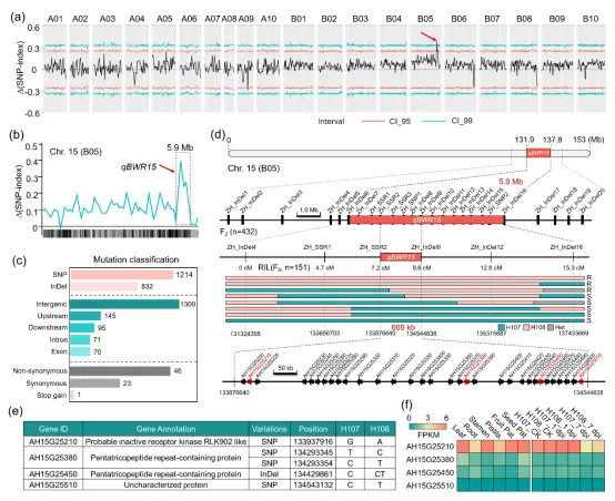 近日,河南农业大学殷冬梅教授团队在Plant Biotechnology Journal上发表了题为“AhBWR15, A Novel RLK Gene, Confers Resistance to Ralstonia solanacearum in Peanut”的研究成果,该研究在Chr15染色体精细定位到抗青枯病的关键基因AhBWR15,该基因能够通过激活脱落酸(ABA)信号通路来显著增强对青枯病的抗性,为培育抗青枯病花生品种提供了宝贵的遗传资源。花生(Arachis hypogaea L.)是全球范围内最具重要性的油料和经济作物。青枯病(BW)是由青枯菌(Ralstonia solanacearum)引起的严重花生病害,导致花生种子质量下降以及严重的产量损失(50%-100%)。该研究选取殷冬梅教授培育的高抗青枯病品种“农大花 108”(H108)和易感品种“农大花 107”(H107)构建 F2 群体(432 个单株),通过重测序和BSA分析,在 Chr15 号染色体131.98-137.77 Mb 区间定位到一个新的主效 QTL qBWR15,进一步开发分子标记将 qBWR15 精细定位至668 kb 区域,其中编码亮氨酸受体激酶(LRR-RLK)的基因(命名为 AhBWR15)被确定为关键候选基因(图1)。图1花生青枯病抗性基因qBWR15的精细定位
