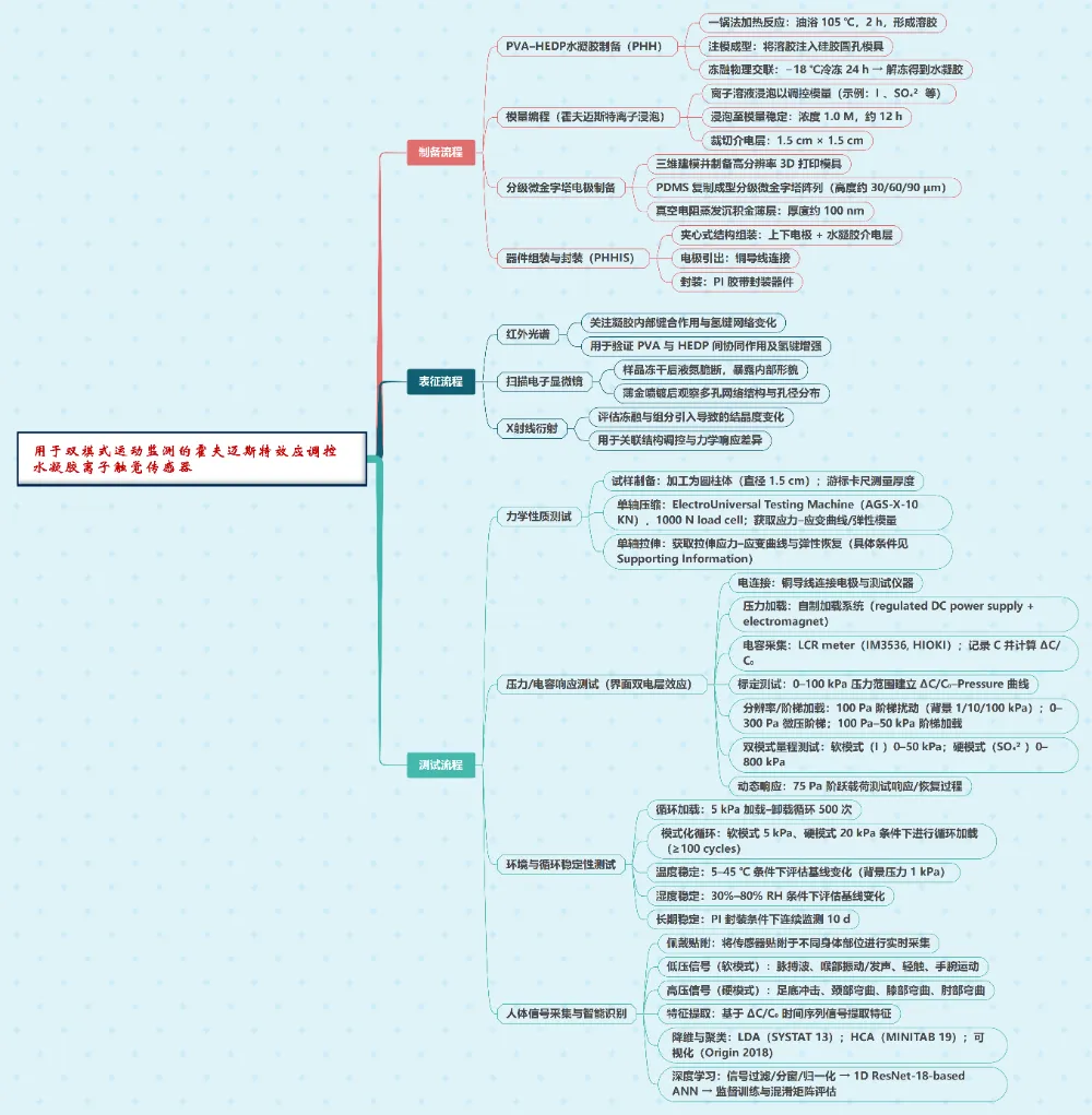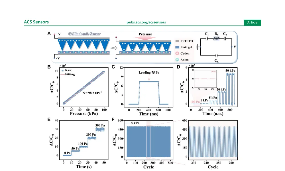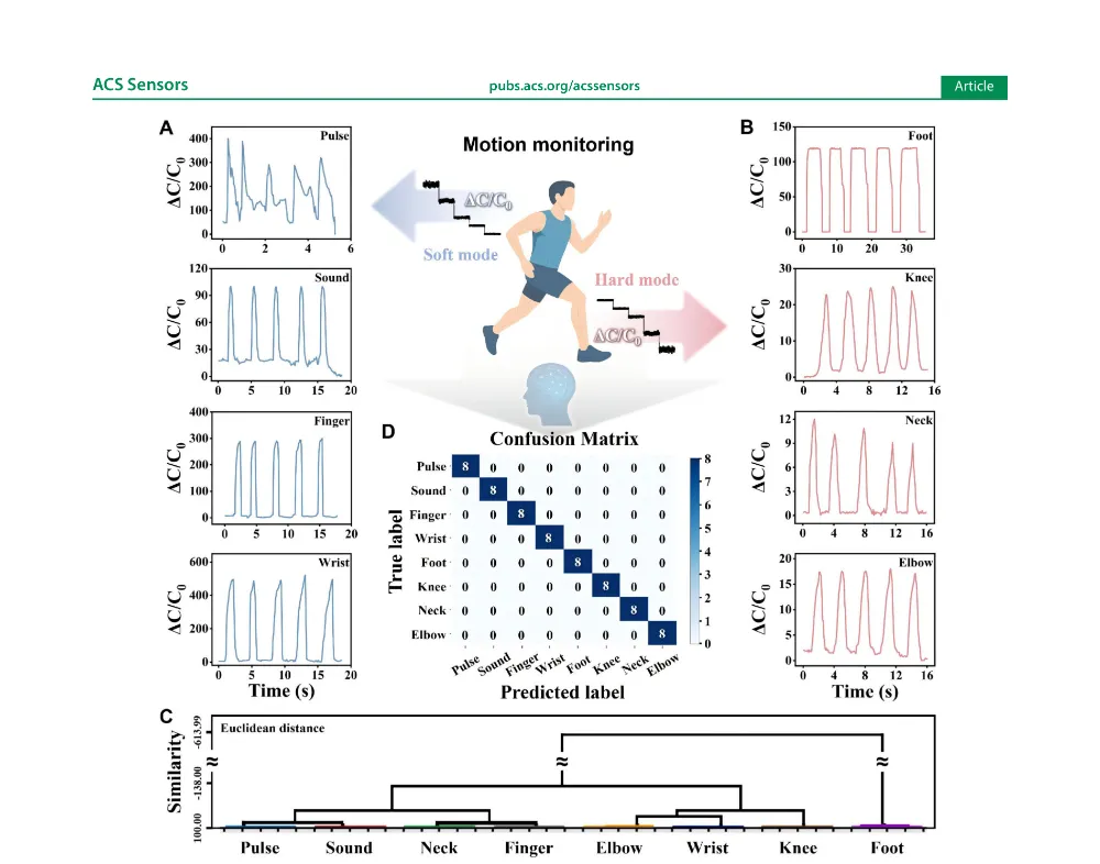 霍夫迈斯特效应调控的水凝胶离子触觉传感器用于双模式运动监测为应对可穿戴运动/健康监测中“微弱生理信号—高载荷肢体运动”跨尺度压力输入难以被同一器件兼顾的核心挑战,安徽农业大学Ying Lu团队提出一种由霍夫迈斯特效应调控模量可编程的PVA–HEDP导电水凝胶离子触觉传感器(PHHIS)思路,通过离子特异性水化作用在不改变材料化学组成的前提下实现水凝胶力学模量的大范围、可切换调控,从而构建互补的软/硬双工作模式。具体而言,研究团队采用一锅法制备PVA–HEDP水凝胶并通过冻融结晶增强物理交联稳定性,随后分别引入弱水化I⁻与强水化SO₄²⁻等离子溶液浸泡调控氢键网络与含水结构,得到适用于不同压力区间的软模与硬模介电层;同时,器件电极端构建分级微金字塔阵列,实现随压力递增的“顺序接触”以扩大有效接触面积并抑制高压饱和,利用水凝胶–电极界面双电层(EDL)电容的显著面电容效应放大压力响应信号(ΔC/C₀)。在性能上,软模在0–50 kPa内实现超高灵敏度238.4 kPa⁻¹,适于脉搏、发声/喉部振动等微弱信号采集;硬模在0–800 kPa内保持稳定线性响应(灵敏度1.5 kPa⁻¹),适于肢体弯曲、足底冲击等高压动作监测。在应用层面,作者对8类人体信号进行实时采集,并结合特征提取与LDA、HCA以及基于ResNet-18的一维人工神经网络(ANN)实现100%分类准确率,展示了“材料模量编程—界面离子触觉换能—智能识别”一体化方案在多部位、多场景运动监测中的可扩展潜力。相关论文以“Hofmeister Hydrogel Iontronic Sensor for Dual-Mode Motion Monitoring”为题,发表在ACS Sensors上。技术路线图(部分)如下:研究动机:柔性可穿戴电子正快速走向生命体征监测、康复辅助与人机交互等应用,但实际人体信号的压力幅值跨度巨大——从亚kPa级的脉搏/声带振动到百kPa乃至更高的肢体运动与足底冲击。单一压力传感器若仅追求高灵敏度,往往会在高压区出现饱和或线性失真;若扩展量程,又容易牺牲低压分辨与信噪比。前人工作瓶颈:传统压阻/电容/压电/摩擦电等机制常呈现固定的结构—性能耦合关系,难以针对不同身体部位与使用场景进行“按需适配”;同时,很多离子触觉器件的凝胶介电层具有固定机械模量,使得器件的可变形性与界面接触演化受限,进一步加剧了灵敏度—量程权衡与信号稳定性问题。本工作的解决方案:本研究以霍夫迈斯特效应为抓手,通过离子特异性水化强弱对水凝胶氢键网络与含水结构的重构作用,实现PVA–HEDP导电水凝胶模量的可编程调控,从而在同一器件平台上构建软/硬双模式以覆盖低压高灵敏与高压宽量程两类需求;并叠加分级微金字塔电极阵列,使压力加载过程中接触面积按阶段增长,兼顾低压增益与高压线性。引出关键问题:如何在不引入复杂化学改性与结构重构的前提下,实现水凝胶介电层的宽范围、可切换力学调控,并与离子触觉界面换能机制协同,以获得跨尺度压力感知与高鲁棒性信号识别?图1 中文图注:用于运动监测的霍夫迈斯特效应调控PAV-HEDP水凝胶离子触觉传感器(PHHIS)。(A)PHHIS结构:压力作用下水凝胶变形改变界面双电层(EDL)电容,产生信号(ΔC/C₀)。(B)模量调控:强水化离子(如SO₄²⁻)通过盐析形成“硬模式”凝胶;弱水化离子(如I⁻)通过盐溶形成“软模式”网络。(C)运动监测:电容信号由人工神经网络(ANN)进行分类;软模式捕捉微弱活动(脉搏、声音),硬模式识别高压运动(肢体弯曲与足步冲击)。图2 中文图注:PHHIS的工作机理与电学性能。(A)PHHIS工作原理及等效电路示意图。(B)电容响应随外加压力变化曲线,灵敏度为98.2 kPa⁻¹。(C)在75 Pa压力下的快速响应与恢复行为。(D)不同压力(100 Pa-50 kPa)下的阶梯响应,插图为100 Pa信号放大图。(E)微压条件(0-300 Pa)下的分级加载响应。(F)在5 kPa压力下连续500次循环的稳定性测试。图3 中文图注:霍夫迈斯特效应对PHH力学性质与电导率的调控。(A)不同离子处理PHH的压缩应力-应变曲线。(B)不同阴离子处理条件下PHH的杨氏模量对比。(C)不同离子处理条件下PHH的电导率对比。(D)FT-IR光谱揭示不同离子对PHH内部氢键(O-H)结构的影响。图4 中文图注:PHHIS在软/硬模式下的力学与电学性能对比。(A)I⁻(软模式)、空白以及SO₄²⁻(硬模式)处理水凝胶的压缩应力-应变曲线。(B)三种PHH的杨氏模量对比。(C)三种模式下传感器的电容-压力响应曲线(对应软模式、空白与硬模式)。(D)硬模式与(E)软模式在75 Pa压力下的响应/恢复时间曲线。(F、G)分别在20 kPa(硬模式)与5 kPa(软模式)条件下的循环稳定性测试,并给出选定区域的放大图。图5 中文图注:基于软/硬模式PHHIS的高性能运动监测。(A)软模式采集的代表性人体信号,包括脉搏、声音、手指与手腕运动。(B)硬模式采集的代表性动作信号,包括足部、膝部、颈部与肘部运动。(C)八类人体运动信号的层次聚类分析(HCA)树状图。(D)基于ANN模型对八类人体运动信号识别的训练集混淆矩阵。提出“霍夫迈斯特效应调控模量可编程水凝胶离子触觉传感”新范式:仅通过更换浸泡离子种类(如I⁻与SO₄²⁻),在不改变PVA–HEDP化学组成的条件下实现模量从约50 kPa到约1170 kPa的宽范围调节,并据此构建可切换的软/硬双工作模式。构建分级微金字塔电极阵列实现顺序接触换能:通过不同高度微金字塔在压力增加时逐级参与接触,获得连续扩大的有效界面接触面积,提升低压区灵敏度并抑制