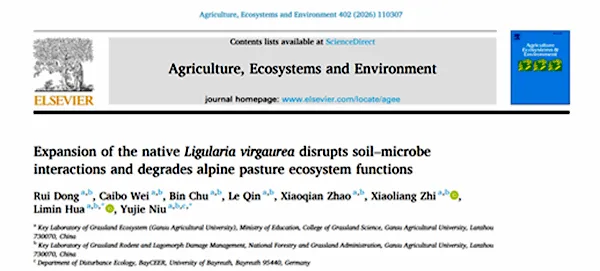 近日,甘肃农业大学草业学院花立民教授和柔性引进人才牛钰杰博士作为通讯作者在Agriculture, Ecosystems and Environment期刊上发表题为Expansion of the native Ligularia virgaurea disrupts soil–microbe interactions and degrades alpine pasture ecosystem functions的文章。论文第一作者为甘肃农业大学草业学院博士研究生董瑞。