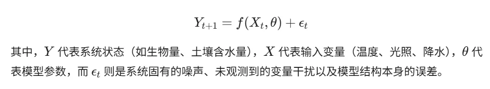 任何试图模拟自然界的模型,都不可避免地包含误差。一个典型的农业预测模型(如作物生长模拟或需水量预测)在数学上可以抽象为: