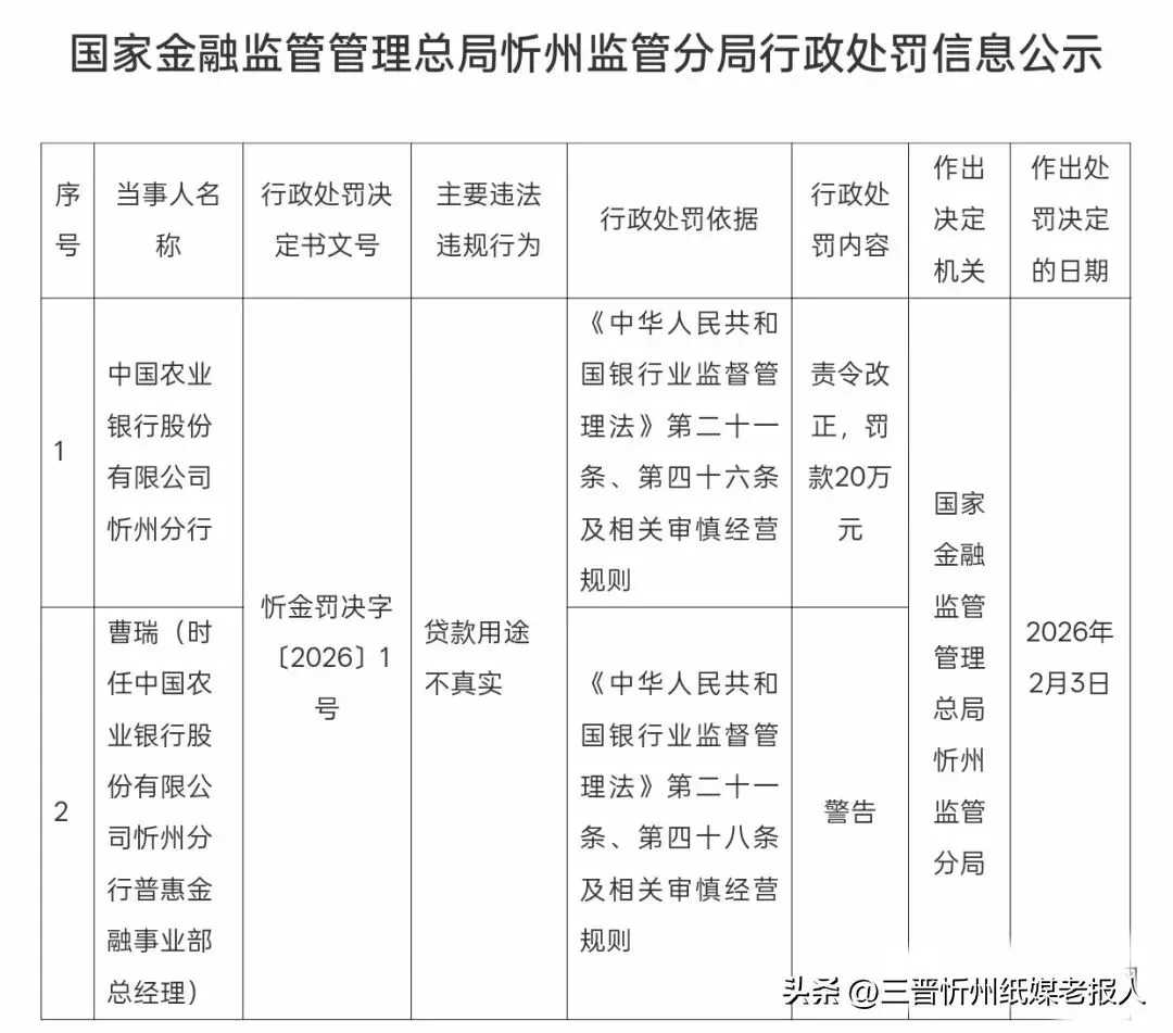 忻州金融一号罚单,2026年春节前夕,国家金融监督管理总局网站发布处罚决定,中国农业银行忻州分行因贷款用途不真实被责令改正并罚款20万元,时任相关负责人曹某予以警告处分。