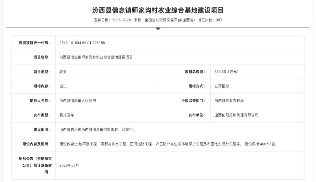 农业基地项目:汾西县僧念镇师家沟村计划投资663.85万元建设农业综合基地,涉及土地平整、灌溉排水等工程,目前正进行招标 。