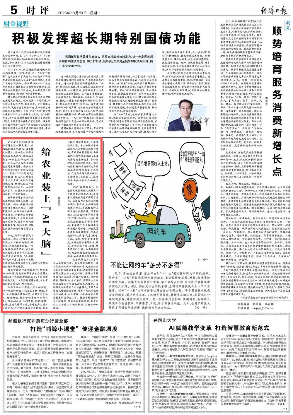 近日举办的2025年首届智慧农业创新大赛上,对靶施药除草机器人、温室搬运机器人、巡田无人机等智慧农业发展成果,让观众享受了一场农业科技的“盛宴”,也让人对未来农业的发展空间充满期待。国务院不久前印发的《关于深入实施“人工智能+”行动的意见》明确提出,加强人工智能在农业生产管理、风险防范等领域应用,帮助农民提升生产经营能力和水平。人工智能的引入,有望把农业智能化推到一个新的高度。