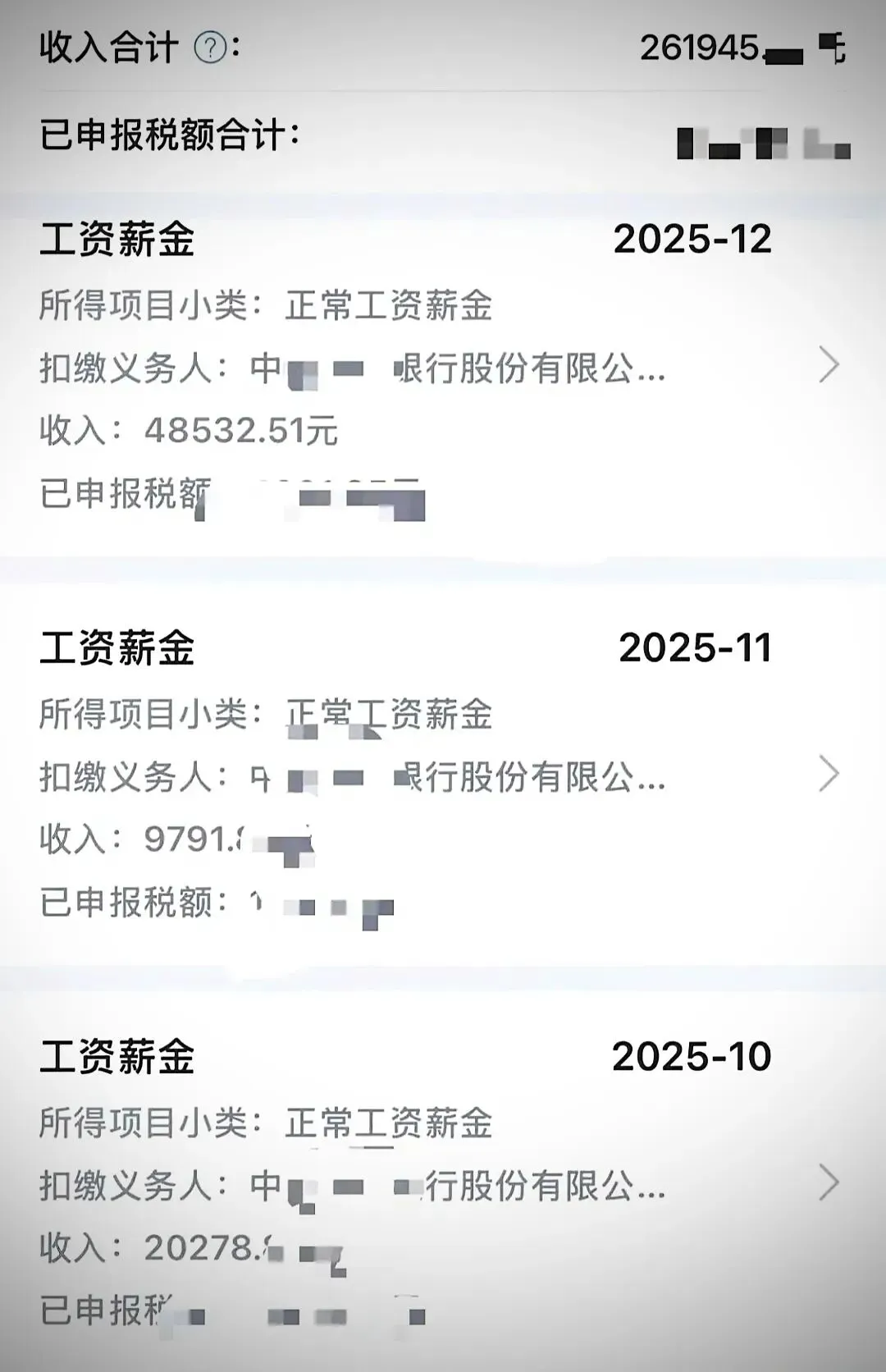 你也可以看一下这份工资单,他10月份的工资是2万多,11月份的工资是9700多,12月份的工资就接近5万,一年总收入呢超过26万。