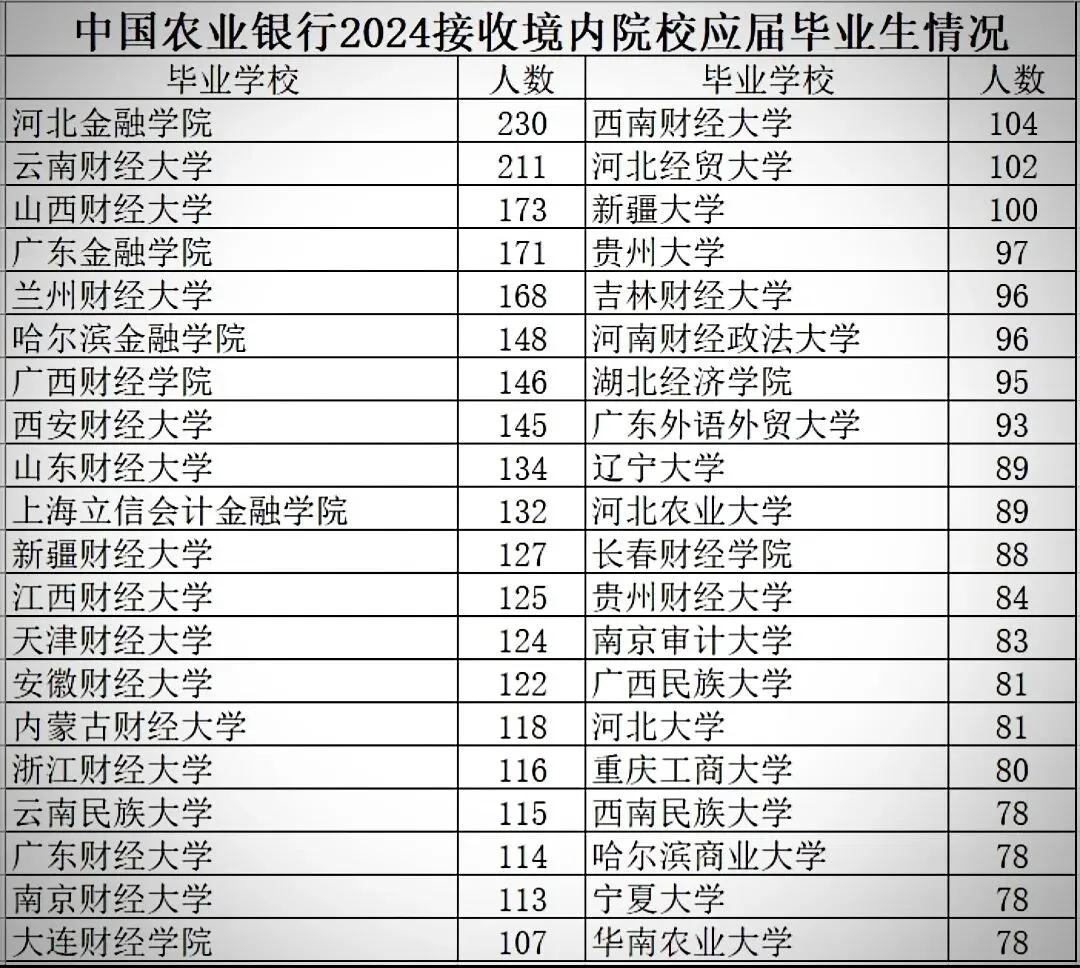 你看上面这份榜单,这是中国农业银行2024年录用毕业生人数和院校的排行榜单。