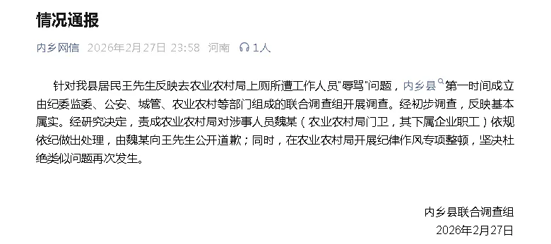 针对我县居民王先生反映去农业农村局上厕所遭工作人员“辱骂”问题,内乡县第一时间成立由纪委监委、公安、城管、农业农村等部门组成的联合调查组开展调查。经初步调查,反映基本属实。经研究决定,责成农业农村局对涉事人员魏某(农业农村局门卫,其下属企业职工)依规依纪做出处理,由魏某向王先生公开道歉;同时,在农业农村局开展纪律作风专项整顿,坚决杜绝类似问题再次发生。
