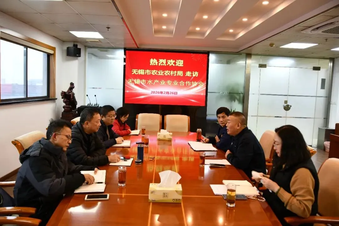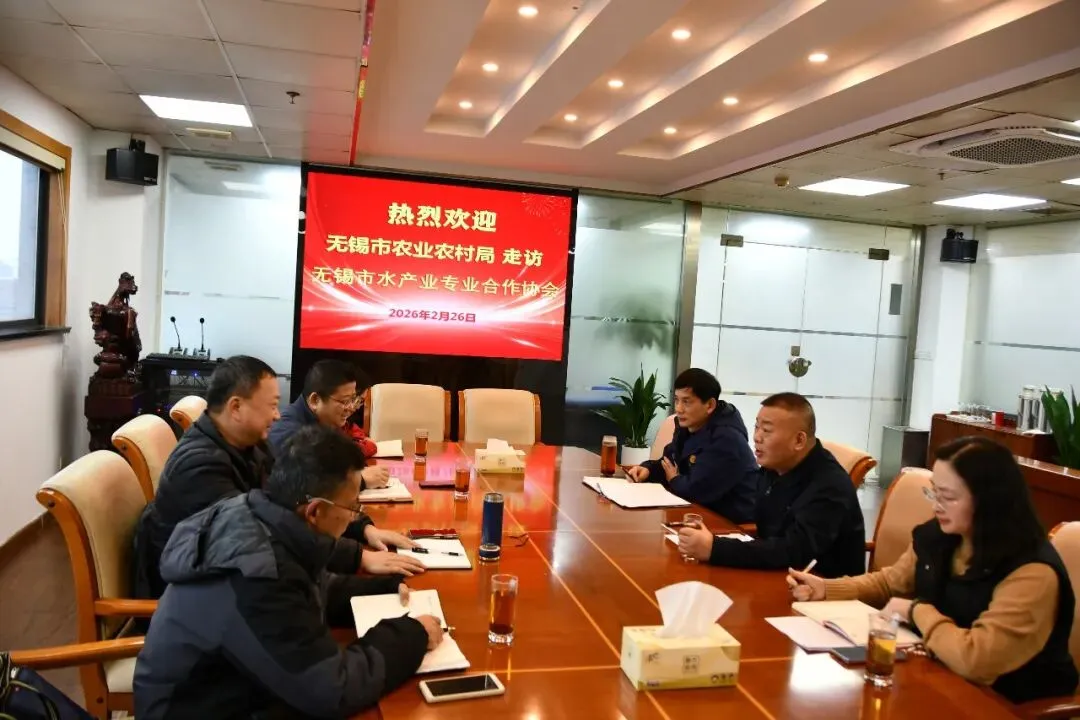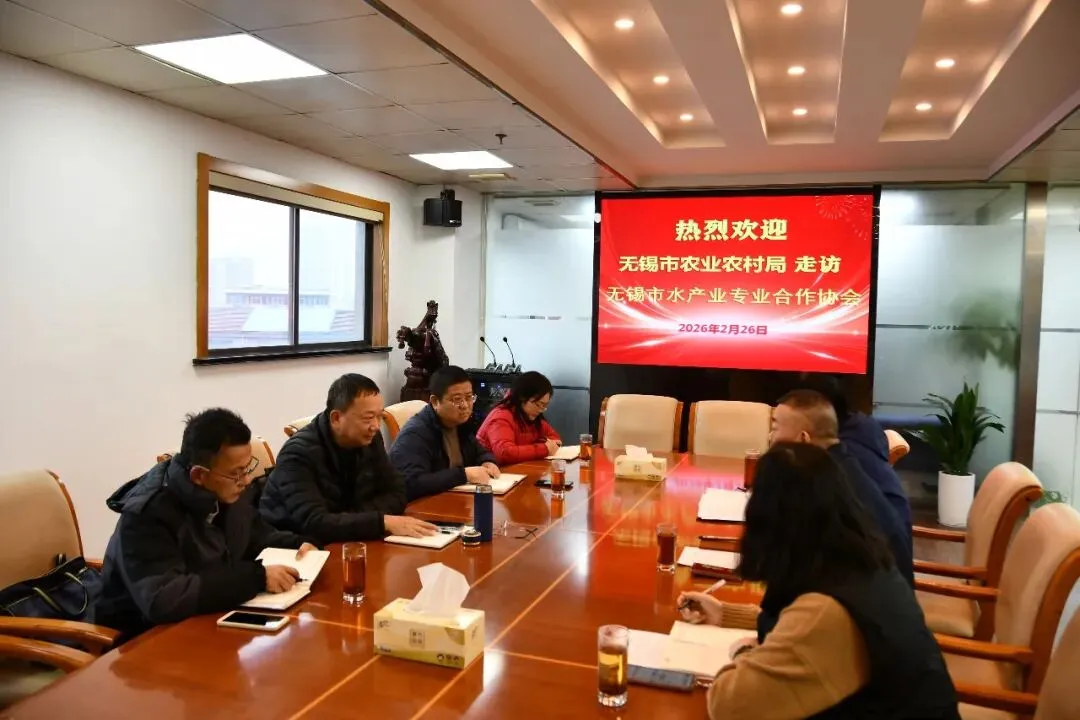 2026年2月26日,无锡市农业农村局养殖业管理处处长盖振东、水产畜牧技术推广中心主任张宪中带领高级工程师何俊、高级畜牧兽医师熊沈学一行,专程来到无锡市水产业专业合作协会会长单位无锡盛阳食品城有限公司,开展春节后的走访对接工作。