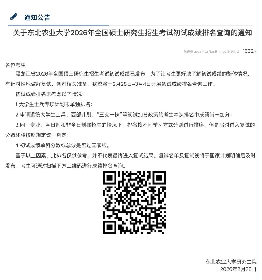 关于东北农业大学2026年全国硕士研究生招生考试初试成绩排名查询的通知