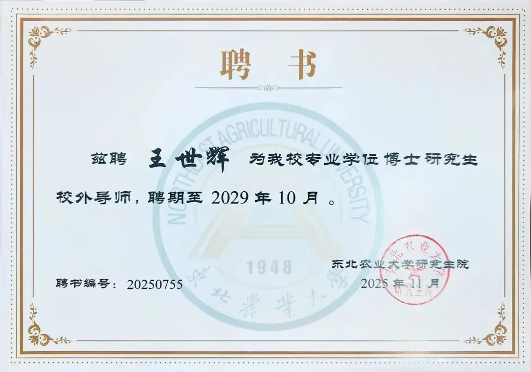 近期,中新科农董事长王世辉正式受聘为东北农业大学专业学位博士研究生校外导师,聘期至2029年10月。