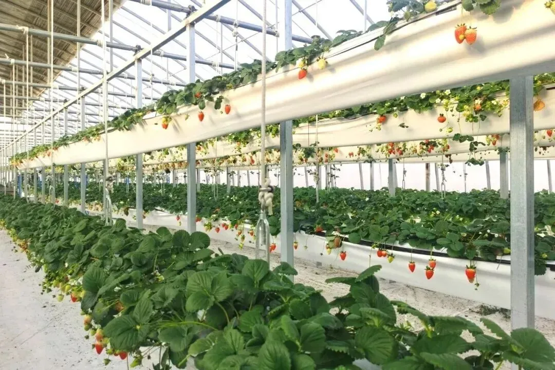 北京郊区,机器人穿梭育种大棚,番茄周期减半;河南养猪场,小猪住六层“洋楼”,一头猪撬动百亿产业;四川水田,AI插秧机自己干活。而在盐城,草莓也住上“第四代住宅”,能“乘电梯”上下。