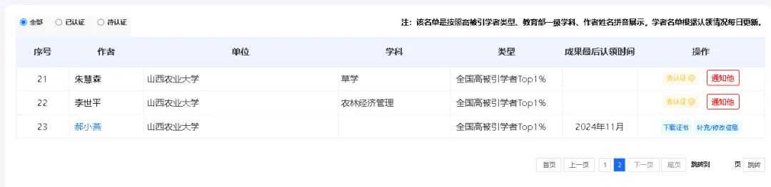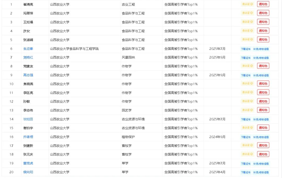 >山西农业大学 23 位学者入选知网“2025全国高被引学者Top1%”
