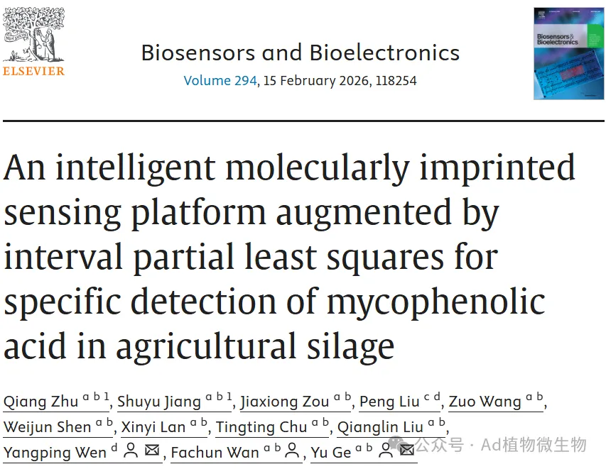 近日,湖南农业大学动物科学技术学院南方草食动物研究中心万发春教授团队在国际权威期刊《Biosensors and Bioelectronics》(影响因子10.5,中科院TOP一区)上发表了一项重要研究成果,题为“An intelligent molecularly imprinted sensing platform augmented by interval partial least squares for specific detection of mycophenolic acid in agricultural silage”。该研究聚焦于青贮饲料中一种由娄地青霉菌产生的免疫抑制性真菌毒素——霉酚酸(mycophenolic acid, MPA)。这种毒素易在青贮过程中残留,不仅对畜禽健康构成潜在威胁,也可能通过食物链影响人类食品安全。