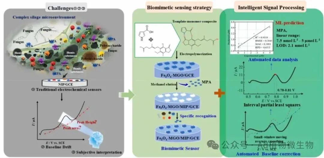 然而,在复杂青贮基质中对霉酚酸进行精准检测一直面临严峻挑战,主要受限于现有方法的选择性不足以及电化学信号基线漂移严重等问题。针对这一难题,研究团队创新性地开发了一种智能分子印迹电化学传感平台(Fe₃O₄-MGO/MIP/GCE)。该平台以磁性氧化石墨烯(Fe₃O₄修饰的MGO)作为高导电性基底,并选用3-羧酸吡咯(pyrrole-3-carboxylic acid, Py3C)作为兼具识别与聚合功能的双功能单体。在霉酚酸模板分子存在下,Py3C通过电聚合形成具有特异性识别空腔的分子印迹层,同时实现目标物结合与电信号转换的一体化设计。