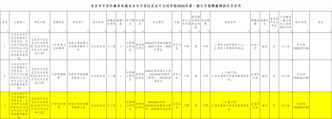 本次招聘共涉及北京市平谷区农业中关村学校的3个岗位,计划招聘教师3名。