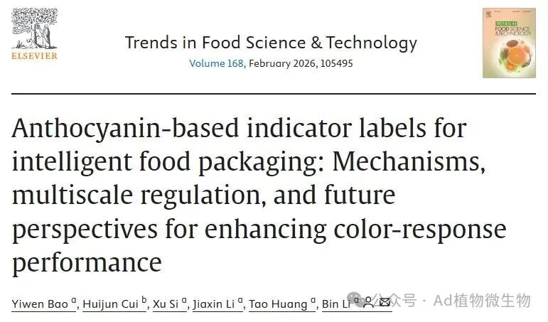 近日,沈阳农业大学食品学院李斌教授团队在国际权威期刊《Trends in Food Science & Technology》(中科院一区Top期刊,五年影响因子18.4)在线发表了一篇题为“Anthocyanin-based indicator labels for intelligent food packaging: Mechanisms, multiscale regulation, and future perspectives for enhancing color-response performance”的综述论文。该文由博士研究生鲍义文担任第一作者,李斌教授为通讯作者。