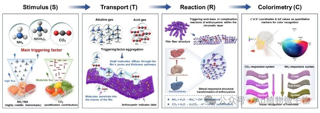 文章立足于对花色苷颜色响应机制的系统梳理,创新性地提出了“刺激–传质–反应–色度”(S-T-R-C)理论框架,从外部环境信号的输入出发,深入解析了花色苷分子结构在响应过程中的动态变化,并最终关联至可视化的光学输出,从而完整揭示了花色苷智能标签在复杂食品体系中的耦合响应机制。