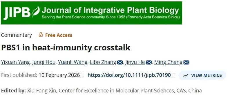 近日,南京农业大学生命科学学院常明教授团队联合贵州大学张利博教授团队,在植物科学专业期刊Journal of Integrative Plant Biology(JIPB)发表评论文章“PBS1 in Heat-Immunity Crosstalk”,围绕植物体内关键激酶PBS1在高温胁迫与免疫反应交叉调控中的潜在作用进行了系统讨论。