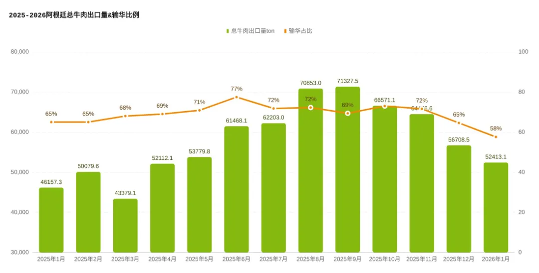 1.屠宰量:1月牛肉出口量达52,413吨(环比-8.2%,同比+12.2%),考虑到1月屠宰量下降11.8%,这一出口量的同比增幅十分亮眼。出口总额3.329亿美元(环比-2.2%,同比+44.2%)。中国市场占比持续下滑,1月中国占阿根廷牛肉总出口的57.4%(环比-7%)。