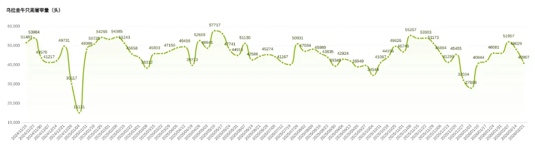 2.活牛市场:受应偏紧与出口需求强劲支撑,出口用牛价格保持在纪录高位,市场前景依旧向好。优质出口阉牛价格Ar$8,000-8,350/kg CW,母牛价格Ar$6,600-6,800/kg CW,中国母牛Ar$5,200-5,600/kg CW。美元对阿根廷比索贬值2%,美元价格上涨13¢至$6.41/kg CW。