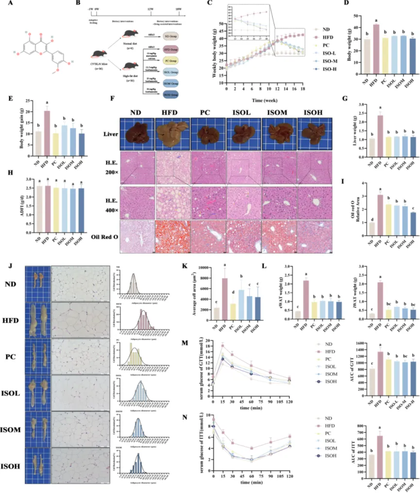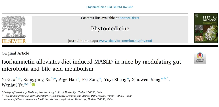 随着高糖高脂饮食习惯的普及,代谢相关脂肪性肝病(MASLD)已成为全球最主要的慢性肝病。由于其病理机制复杂,目前仍缺乏多靶点、低副作用的理想药物。异鼠李素(Isorhamnetin, ISO)作为一种广泛存在于沙棘、银杏等植物中的天然黄酮类化合物,虽已知具有调脂潜力,但其是否通过肠道微生态发挥作用尚不明确。由东北农业大学于文会教授和姜晓文教授团队,在植物药理学顶刊 Phytomedicine 发表题为“Isorhamnetin alleviates diet induced MASLD in mice by modulating gut microbiota and bile acid metabolism”的研究,揭示了 ISO 通过重塑肠道菌群、调节胆汁酸代谢并激活 FXR 信号轴,系统性改善肝脏脂质沉积的新机制。