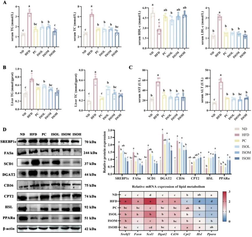 2. 调节肝脏脂质代谢平衡:抑制合成与促进氧化 为了探究 ISO 对肝脏脂质分子的具体影响,团队检测了代谢关键基因。结果发现,ISO 显著下调了生脂基因(如 SREBP1c, FASn, SCD1)的表达,同时上调了负责脂肪酸 β-氧化的基因(如 PPARα, CPT2)。这意味着 ISO 不仅能从源头上“节流”减少脂肪合成,还能在末端“开源”加速脂肪消耗,从而纠正肝脏的脂质代谢紊乱。